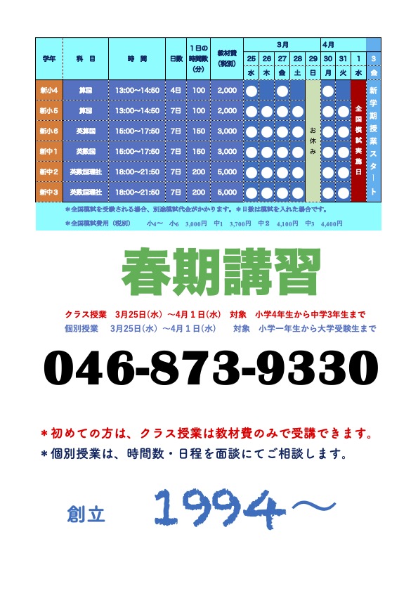 3月25日から4月1日の期間、春期講習を開催します。